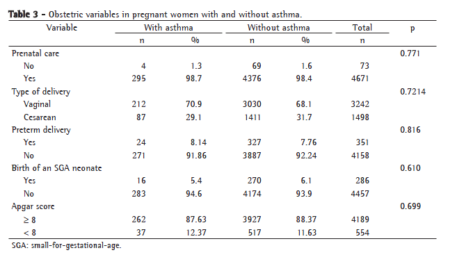 We observed that, regarding SGA neonates, the diagnosis of maternal asthma, per se, did not imply a risk of adverse effects for the neonate. This finding led us to infer that the clinical presentation of asthma among the pregnant women evaluated in the present study was not severe, since asthma that is more severe (resulting in hypoxemia) would be likely to induce a certain degree of IUGR.(27)