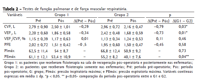 É evidente, nos dois grupos estudados, a queda na função pulmonar no período pós-operatório quando comparado ao pré-operatório, embora uma diferença estatisticamente significativa tenha sido encontrada somente no G2 (CVF e VEF1). Esse dado vai ao encontro dos achados de alguns autores, que demonstraram uma redução de 47% na capacidade vital de pacientes submetidos à gastroplastia em conjunto com uma redução significativa na força muscular respiratória.(11) Da mesma forma, outros autores demonstraram uma redução na força muscular respiratória em pacientes submetidos a laparotomias superiores eletivas, e que esta se apresentou menor que os valores previstos no período pré-operatório.(12) Neste mesmo estudo, encontrou-se uma redução no VEF1 e que estes indivíduos apresentavam um aumento de 6,5 vezes no risco de complicações pulmonares pós-operatórias quando comparados