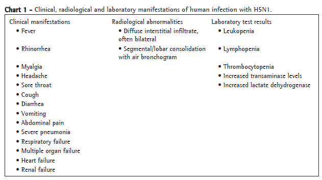 Chart 1 shows the principal clinical, radiological and biochemical manifestations of infection with H5N1.