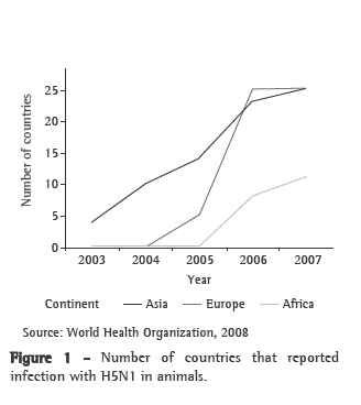 At the end of 2003, an outbreak of avian influenza was identified in chicken in South Korea, lasting until September of 2004. From the beginning of 2004, the pandemic began to affect other countries: Thailand, Japan, Cambodia, Laos, Indonesia and Malaysia. In the following year, new cases were identified in Russia, Kazakhstan, Mongolia, Turkey and Kuwait. For the first time, cases in animals outside of Asia were also reported, having been described in Europe (England, Romania, Croatia and the Ukraine). In 2006, the pandemic affected other countries: in Asia and the Middle East (Iraq, Iran, India, Pakistan, Israel, Jordan and Afghanistan); in Europe (Bulgaria, Greece, Slovenia, Italy, Germany, France, Albania, Austria, Bosnia, Slovakia, Hungary, Azerbaijan, Georgia, Serbia and Montenegro, Switzerland, Poland, Denmark, Sweden, the Czech Republic and Spain); and Africa (Nigeria, Egypt, Cameroon, Sudan, Djibouti). In addition, between August and September of 2006, viral antigens were detected in swans and ducks in the United States. In 2007, Bangladesh, Saudi Arabia, Ghana, Myanmar and Benin also reported new cases in domestic birds. Infection with the H5N1 virus in chicken is already considered endemic in China, Cambodia, Thailand and Laos. It is estimated that it will take several years to control the disease in these regions.(1,2) Figure 1 shows the distribution of infection with H5N1 in animals.