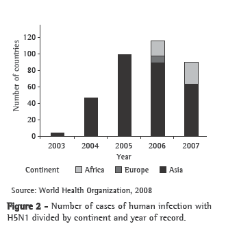 The cases of avian influenza in humans followed the same course as that of those in birds. In 2004, 46 cases were reported in Vietnam and Thailand, with 32 deaths (69.6%). In 2005, there were 98 cases (43 fatal; 43.9% mortality), affecting China, Indonesia, Thailand, Vietnam, Cambodia and Indonesia. In 2006, 115 cases occurred, with 79 deaths (68.7%), the first cases being reported outside of Asia (in Azerbaijan, which is in Eastern Europe, as well as in Djibouti and Egypt, which are in Africa). In 2007, Nigeria, Myanmar, Pakistan and Laos confirmed the first cases in humans, the same occurring in Bangladesh in 2008. As of 10 September 2008, the WHO had confirmed 387 cases in humans, with 245 deaths, representing a mortality rate of 63.3%.(1,3,17) Figure 2 shows the number of cases of human infection with H5N1, by year and location.