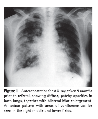 A 63-year-old female patient with diabetes and hypertension was referred to the Vallabhbhai Patel Chest Institute at the University of Delhi, in the city of Delhi, India, for evaluation of progressive pulmonary disease. Her clinical course over the preceding 18 months had been characterized by paroxysmal attacks of dry cough, gradually increasing breathlessness and intermittent low-grade fever. This had been accompanied by malaise, anorexia and weight loss. Although sputum smears had consistently tested negative for acid-fast bacilli, the symptom profile and radiological findings had prompted her treating physician to initiate antituberculosis therapy, which was then continued for 9 months but provided no symptom relief.
