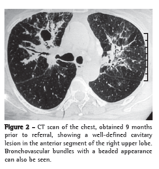 On reviewing a chest X-ray taken 9 months prior to referral, when antituberculosis therapy had been initiated, we observed diffuse, patchy opacities in both lungs, together with bilateral hilar adenopathy (Figure 1). An acinar pattern with areas of confluence was apparent in the right middle and lower fields. A CT scan of the chest, also obtained 9 months prior to referral, showed a well-defined cavitary lesion, not visible on the chest X-ray, in the anterior segment of the right upper lobe (Figure 2). In addition, we observed ground-glass opacities, accompanied by perihilar areas of consolidation and bronchovascular bundles with a beaded appearance. Bilateral hilar lymphadenopathy and asymmetric mediastinal lymphadenopathy, without caseation or rim enhancement, were also present. The cavitation seen on the CT scan probably prompted the initiation of the antituberculosis therapy. The laboratory evaluation at that time showed hemoglobin of 13.3 g/dL, with a total leukocyte count of 6,700 cells/mm3 and a normal differential leukocyte count. Although routine urine testing revealed traces of glucose, blood glucose values were within the normal range, since the patient was under treatment with oral hypoglycemic agents. The results of liver and kidney function tests, as well as the lipid profile and electrocardiographic findings, were also within normal limits. Sputum smear microscopy and culture for Mycobacterium tuberculosis and other aerobic organisms continued to yield negative results. Tuberculin testing with a 5-TU dose of PPD resulted in no induration.