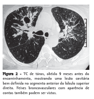 Ao rever uma radiografia de tórax realizada 9 meses antes do encaminhamento, quando do início do tratamento com drogas antituberculose, observamos opacidades difusas com distribuição segmentada em ambos os pulmões, associadas à adenopatia hilar bilateral (Figura 1). Um padrão acinar com áreas de confluência era aparente nos campos médio e inferior direito. Uma TC de tórax, também obtida 9 meses antes do encaminhamento, mostrou uma lesão cavitária bem definida, não visível na radiografia de tórax, no segmento anterior do lóbulo superior direito (Figura 2). Além disso, observamos opacidades em vidro fosco, associadas a áreas peri-hilares de consolidação e feixes broncovasculares com a aparência de contas. Linfadenopatia hilar bilateral e linfadenopatia mediastinal assimétrica, não caseosas e sem realce das bordas, também estavam presentes. A cavitação vista na TC de tórax provavelmente levou ao início do tratamento com drogas antituberculose. A avaliação laboratorial realizada naquele momento revelou hemoglobina de 13,3 g/dL, com contagem total de leucócitos de 6.700 células/mm3 e contagem diferencial de leucócitos normal. Embora o teste rotineiro de urina revelasse traços de glicose, os valores glicêmicos estavam dentro da normalidade, já que a paciente estava em tratamento com agentes hipoglicêmicos orais. Os resultados dos testes de função hepática e renal, bem como o perfil lipídico e os achados eletrocardiográficos, também estavam dentro dos limites de normalidade.