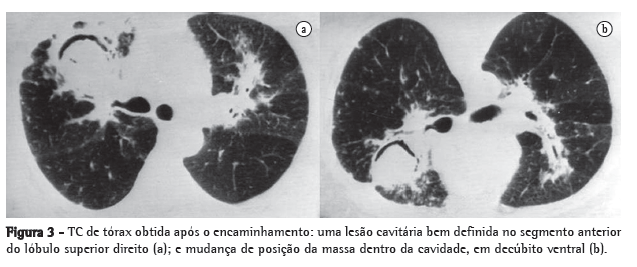 Estabeleceu-se um diagnóstico de sarcoidose pulmonar e, desse momento em diante, o tratamento com drogas antituberculose deixou de ser administrado. A paciente iniciou o uso de prednisolona oral na dose de 30 mg/dia. Após 2 semanas, a dose foi reduzida para 30 mg em dias alternados e, em seguida, gradualmente diminuída durante 6 meses a uma taxa de 5 mg/mês. Houve notável melhora clínica. Entretanto, durante o oitavo mês de tratamento, a paciente apresentou hemoptise. Uma radiografia de tórax revelou uma lesão cavitária contendo uma massa associada a sinal do crescente aéreo. A visão em decúbito lateral demonstrou mudança de posição, sugerindo um aspergiloma. Uma nova TC de tórax confirmou a presença de uma massa intracavitária no lóbulo superior direito (Figura 3a), e também foi observada mudança de posição em decúbito ventral (Figura 3b). Entretanto, os gânglios mediastínicos haviam regredido significativamente. O teste intradérmico com antígenos de Aspergillus demonstrou reatividade imediata ao Aspergillus fumigatus. Também foram detectadas precipitinas séricas de A. fumigatus. A hemoptise cedeu com tratamento sintomático. Até o presente momento, a paciente encontrava-se assintomática, embora ainda em tratamento.