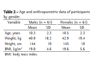 A total of 122 children and adolescents-61 males and 61 females (mean age, 10.26 ± 2.26 years and 10.54 ± 2.26 years, respectively)-were included in the study. The anthropometric characteristics of the sample as a whole are presented in Table 2. There were no differences between males and females in terms of anthropometric parameters.