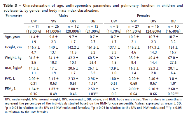 The reference equations proposed by Polgar & Promadhat,(21) Hsu et al.(22) and Mallozi(7) have been used to calculate pulmonary function values (FEV1 and FVC) in children and adolescents. What these equations have in common is height as an independent variable to predict pulmonary function. However, there are no studies showing that these equations reflect pulmonary function in individuals with distinct BMIs.