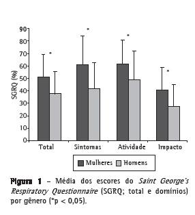 Entretanto, identificamos somente dois estudos que avaliam a contribuição relativa dos diferentes fatores para os escores do ES em pacientes com DPOC de acordo com o gênero.(6,8) Embora a percepção da dispneia tenha sido selecionada como um preditor do ES para homens em ambos os estudos,(6,8) as características associadas ao ES em mulheres diferiu entre os dois estudos.(6,8) Nossas hipóteses são de que as mulheres têm um maior comprometimento do ES que os homens e que os preditores do ES diferenciam-se entre os gêneros. Portanto, o objetivo do presente estudo foi avaliar mais profundamente o ES de pacientes com DPOC separados por gênero através dos escores do Saint George's Respiratórios Questionnaire (SGRQ) e identificar os principais preditores do ES nesses pacientes, que apresentavam uma ampla faixa de distúrbios obstrutivos.