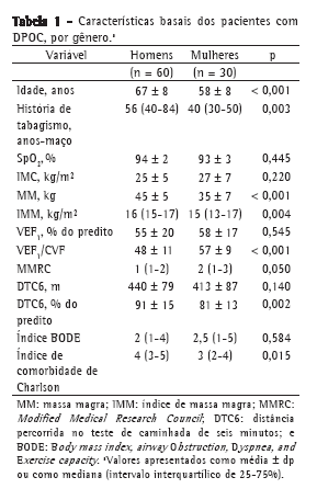 IntroduçãoA DPOC é sabidamente uma doença passível de prevenção e tratamento, caracterizada pela limitação não completamente reversível do fluxo aéreo. Além disso, está bem estabelecido que a DPOC está associada a consequências sistêmicas que interferem negativamente no prognóstico da doença, incluindo a depleção de massa magra (MM),(1) intolerância ao exercício,(2) e o comprometimento do estado de saúde (ES).(3) Embora recentes estudos de vigilância em DPOC mostrem que a prevalência de DPOC e internações devido à doença aumentaram entre as mulheres,(4) existem poucos relatos comparando seu impacto e suas manifestações sistêmicas nos gêneros.(5-10) Os resultados desses estudos sugerem que, entre pacientes com DPOC, a percepção da dispneia, a intolerância ao exercício e o comprometimento do ES são mais elevados nas mulheres que nos homens.(5-10)