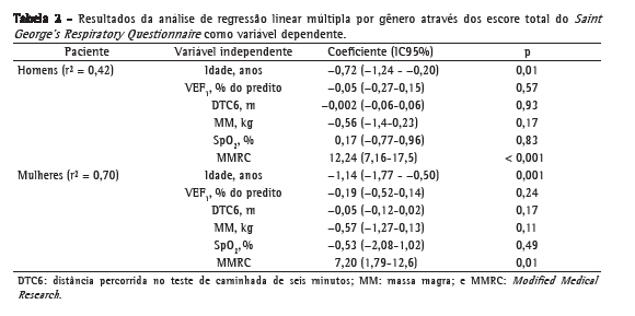 Como pode ser observado na Figura 1, as mulheres mostraram maior comprometimento do ES que os homens pelo escore total do SGRQ e por todos os domínios do SGRQ: total (51 ± 18% vs. 38 ± 19%; p = 0,002); sintomas (61 ± 22% vs. 42 ± 21%; p < 0,001); atividade (62 ± 18% vs. 49 ± 21%; p = 0,004); e impacto (41 ± 19% vs. 27 ± 18%; p = 0,001). Os resultados da análise de regressão linear múltipla por gênero estão apresentados na Tabela 2. A idade e a sensação de dispneia foram associadas ao escore total do SGRQ para ambos os gêneros (p < 0,05).