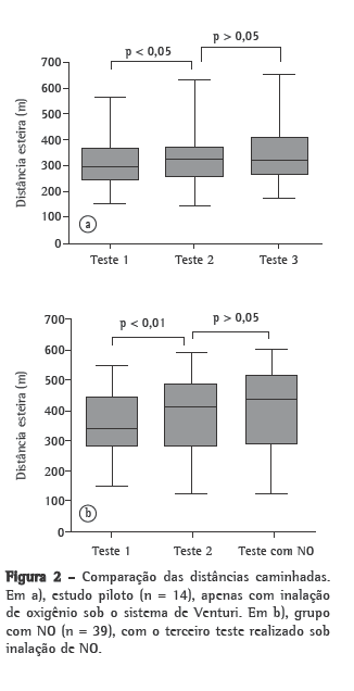 Após o segundo teste, seguia-se um segundo período de descanso de 15 min, no qual o paciente permanecia com o sistema de Venturi a 24% e adicionando-se NO na concentração de 40 ppm. Após esse período, o TC6est era repetido em vigência da inalação do NO pelo mesmo sistema, com a mesma concentração.