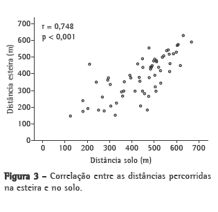 A distância caminhada na esteira apresentou correlação inversa com a classe funcional (r = −0,354; p < 0,05) e direta com a medida do débito cardíaco (r = 0,307; p < 0,05) e com a distância caminhada no TC6 no solo (Figura 3).