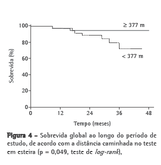 A duração do estudo permitiu ainda a análise da sobrevida da amostra estudada. A avaliação da sobrevida em função da distância caminhada foi realizada após a estratificação dos pacientes em função da mediana da distância caminhada no TC6est (Figura 4); os pacientes que andaram mais que 377 m apresentaram melhor sobrevida em relação aos que não atingiram tal valor de corte.