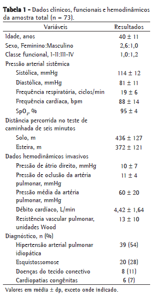 As características clínicas dos 73 pacientes incluídos no estudo podem ser visualizadas na Tabela 1. A idade média, a predominância do sexo feminino e o grau de acometimento hemodinâmico estão de acordo com os dados previamente publicados sobre pacientes portadores de HAP.(11-13)