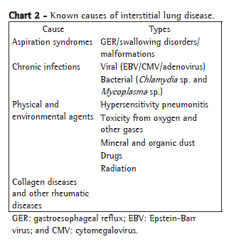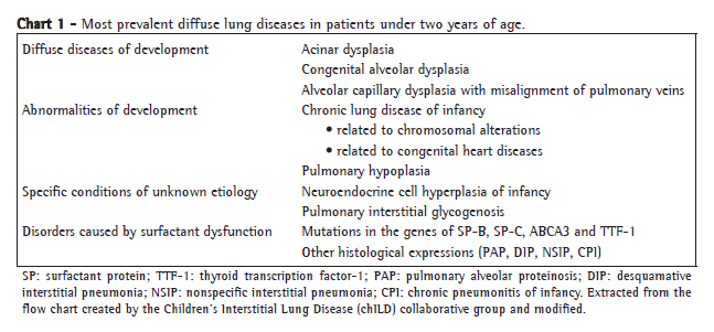 Interstitial lung diseases (ILDs) constitute a heterogeneous group of diseases, the diagnoses of which are a challenge.(1) The term diffuse parenchymatous pulmonary disease is more appropriate to describe such disorders because, in addition to alterations in the alveolar walls and spaces, the distal airways are commonly affected.(2) The genetic factors are taken into consideration due to various reports of cases in the same family and to new information regarding genetic surfactant dysfunction.(3-5) The prevalence of ILD among children is not well-known; some data suggest a prevalence of 3.6 per million.(3) It is probably underdiagnosed and underreported. However, it is certainly quite rare among children.