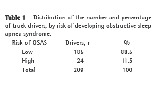 which classifies individuals based on their risk of developing the syndrome. This questionnaire consists of three categories: the first includes questions regarding frequent snoring (3-4 times per week); the second refers to frequent daytime sleepiness (3-4 times per week) or sleepiness while driving; and the third refers to a history of high blood pressure and obesity (BMI ≥ 30 kg/m2). Drivers who fell into at least two of these categories were classified as being at high risk of developing OSAS.(16) It should be emphasized that there are suggestions for changing the interpretation of the scale, as well as for altering the scale itself, such as excluding hypertension and obesity (category 3).(24) In the present study, the classification followed the suggestion of the authors of the scale, since this is the one most commonly adopted.(25)