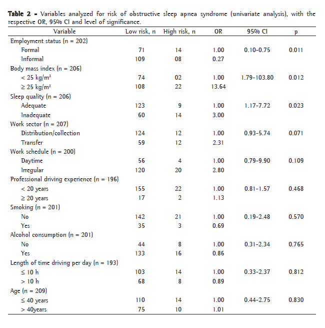 First, a descriptive statistical analysis (means and standard deviations) was carried out. We used univariate and multivariate (forward ­stepwise) logistic regression analysis in order to build the statistical model. In the regression analysis, the following dichotomous categories were created for the variables: BMI (< 25 kg/m2 or ≥ 25 kg/m2); sleep quality (good or poor); work sector (transfer or distribution/collection); work schedule (daytime or irregular); professional driving experience (< 20 years or ≥ 20 years); smoking status (current smoker or not); alcohol consumption (yes or no); length of time driving per workday (≤ 10 h or > 10 h); and age (≤ 40 years or > 40 years). The level of significance was set at 5%. Data analysis was carried out using the STATA program, version 9.0 (Stata Corp.; College Station, TX, USA).