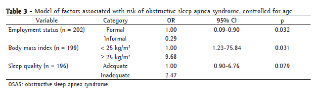 0.032), which demonstrates that the way in which work is organized can influence the health of workers. Poor sleep quality was significant as an adjustment variable in the model (OR =  2.46; p = 0.079), which means that individuals with OSAS have poor quality sleep due to the symptoms characteristic of the syndrome, such as daytime sleepiness. In the final model, the factors associated with OSAS were employment status (OR = 0.29; p = 0.032) and BMI (OR = 9.68; p = 0.03). Although sleep quality was not associated with OSAS, the model showed better adjustment after the inclusion of this variable (OR = 2.47; p = 0.079).
