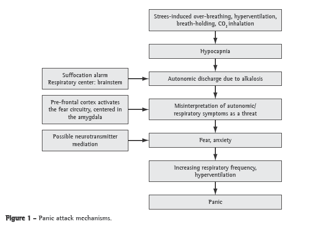 The hyperventilation syndrome seen during panic attacks has been characterized as having a chronic and an acute form.(4) In this conceptual model, it is thought that disturbed breathing causes bursts of hyperventilation and respiratory alkalosis, triggering various somatic signs and symptoms, such as dizziness, tremors and palpitations, which precipitate fear and anxiety.(3) Klein(5) proposed the existence of an evolved "false suffocation alarm" system that triggers spontaneous panic attacks when the brain erroneously signals a lack of useful air and activates maladaptive autonomic responses to suffocation. Sensitivity to CO2 might play a role in this hypersensitive suffocation detector,(5) and various respiratory tests, such as carbon dioxide inhalation,(6)