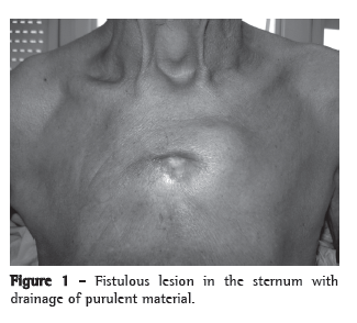 The principal differential diagnoses are malignancy, sarcoidosis, actinomycosis and fungal infections.(6,7) In the literature, there is no consensus regarding treatment modality, treatment duration or the best treatment regimen. Although early drainage and complete debridement improve cicatrization and prevent recurrence, some authors suggest that conservative treatment with antituberculous drugs be performed and surgical debridement be reserved for chronic cases with structural complications or for cases of treatment failure.(2,5,7) The use of prophylaxis in open heart surgery candidates with a history of TB or contact with TB is not indicated due to the rarity of the infection.(9) In our patient, treatment with regimen I resulted in clinical improvement and better cicatrization of the sternal lesion. At this writing, the patient was still under treatment. Surgical debridement was not considered due to the multiple comorbidities presented by the patient.
