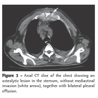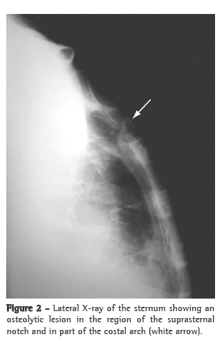 Although CT does not appear to have any advantage over sternum X-ray in the evaluation of bone involvement, it is significantly superior in the evaluation of perilesional soft tissues, mediastinal involvement and pulmonary involvement.(5-9) Magnetic resonance imaging is a good option for the evaluation of soft tissues and bone lesions, revealing early alterations in the bone marrow, especially at early stages with normal X-ray findings.(4,5,9) Technetium triphasic scintigraphy has high sensitivity and specificity for the diagnosis of osteomyelitis.(2,4) In the case presented here, there was no increased radiotracer uptake in the sternum or photopenia in the osteolytic lesion, nor were there any other findings consistent with osteomyelitis.