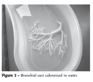 A 53-year-old single (separated) white male, a sailor from Rio de Janeiro and living in the city of Maringá, with diabetes mellitus, as well as a history of alcoholism, smoking and childhood asthma, was admitted to our hospital after having been under treatment (for chronic hepatitis C) with pegylated interferon and ribavirin for four months. Soon after the initiation of treatment, the patient had developed progressive dyspnea and cough, symptoms that had worsened during the two months preceding his admission to the hospital, during which time he had also presented intermittent fever and had lost weight (4 kg). He stated that the cough had been persistent, with occasional "crises". In the week prior to admission, he had presented incapacitating dyspnea that would temporarily cease after the elimination of abundant secretion, which contained bronchial casts (Figures 1, 2 and 3). The effort required in order to eliminate the casts was exhaustive and anguishing-so much so that the patient voluntarily remained in the prone position, with his head and thorax inverted (hanging off the bed), in an attempt to facilitate elimination of the casts. Based on the symptoms presented, treatment with bronchodilators and corticosteroids (oral and inhaled) was started. In the physical examination, the patient presented dyspnea preceding the expectoration of the casts, as well as diffuse rhonchi and wheezing in the pulmonary auscultation. The results of laboratory tests, such as blood workup, determination of electrolyte concentrations, blood gas analysis and identification of inflammatory markers, were normal, with the exception of the serum levels of IgE, which were elevated (300 IU/mL). Other complementary tests, such as HIV serology, as well as investigation of fungi and TB in the casts, also were all negative. Fiberoptic bronchoscopy revealed no endobronchial alterations, and the analysis of the bronchoalveolar lavage fluid collected did not further the diagnosis, the direct mycological examination and culture of the bronchial cast being negative. In an attempt of elucidate the case, we performed transbronchial biopsy, the anatomopathological analysis of which revealed chronic inflammation and interstitial fibrosis in the lung parenchyma, with accumulation of foamy alveolar macrophages and chronic inflammation of the bronchiolar wall. Considering the hypothesis that there is an association between pegylated interferon and bronchial casts, the hepatology team, responsible for the treatment of the liver disease, was encouraged to discontinue the treatment with interferon. No consensus was reached, and the patient therefore continued to receive the treatment until the end of the prescribed period. At 30 days after of the discontinuation of the treatment with interferon and ribavirin, the respiratory symptoms resolved.