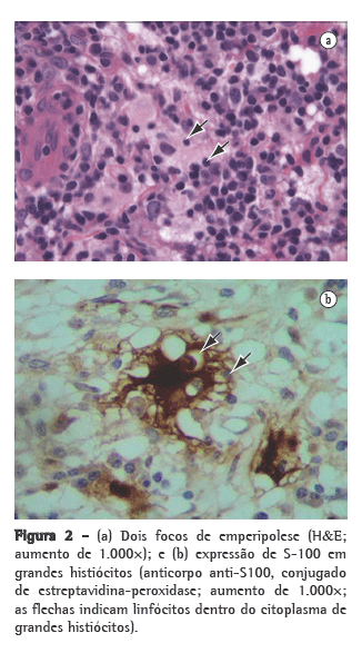 A doença de Rosai-Dorfman (DRD), ou histiocitose sinusal com linfadenopatia maciça, caracteriza-se por linfadenomegalia bilateral indolor maciça que geralmente envolve cadeias linfonodais da cabeça e pescoço. A apresentação típica inclui febre, leucocitose, velocidade de hemossedimentação elevada e hipergamaglobulinemia policlonal. A maioria dos casos ocorre nas duas primeiras décadas de vida, embora qualquer faixa etária possa ser afetada. O perfil morfológico clássico é de um infiltrado inflamatório rico em linfócitos, células plasmáticas e grandes histiócitos, estes últimos apresentando emperipolese ocasional, que é característica da doença.(1) A emperipolese é definida como a penetração ativa de uma célula dentro e através de uma célula maior, a qual, no caso da DRD, se manifesta como linfócitos maduros dentro do
