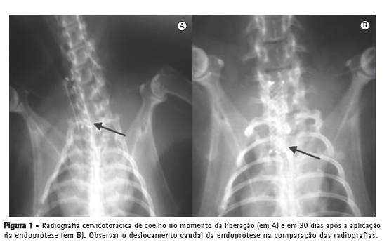 A migração da prótese foi observada em 5 de 6 animais (84%). Entretanto, essa variável só foi analisada nesses animais, pois os outros 7 apresentaram rigidez post mortem, o que impossibilitou a hiperextensão do pescoço para a execução da radiografia, inviabilizando a avaliação da posição precisa da endoprótese. Já foi descrito que as próteses recobertas e aquelas autoexpansíveis apresentam o inconveniente de apresentar um alto grau de migração, e esse resultado corrobora os descritos na literatura (Figura 1).(6,7)