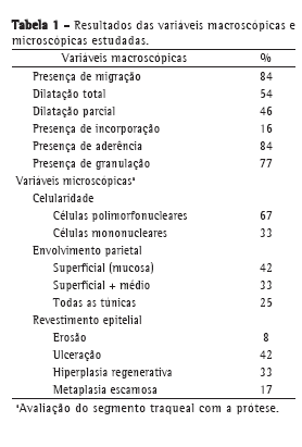 Um fato observado na prática terapêutica com próteses traqueais é a formação de granulomas.(5,6,8) Com relação a essa variável, o presente estudo demonstrou uma frequência de granulomas de 77%, os quais estavam presentes tanto na extremidade proximal quanto na distal da endoprótese.