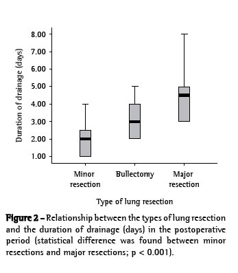 This was a prospective study, with descriptive analysis of the data stored in a spreadsheet (Microsoft Excel®). We used the nonparametric Kruskal-Wallis test (nonparametric analysis of variance) together with Dunn's post-test in order to evaluate the difference noted in the duration of drainage in the postoperative period following lung resection. The level of significance was set at 5% (p < 0.05).