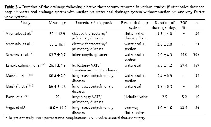 Table 3 shows the results of this study and those of other studies using various drainage systems in the postoperative period following elective lung resection.(6,12,25,26) The data in Table 3 suggest that the duration of pleural drainage with the one-way flutter valve was similar to or shorter than that of other studies.