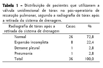Objetivo: Avaliar a drenagem pleural através de válvula unidirecional de tórax no pós-operatório de ressecção pulmonar eletiva. Métodos: Foram realizadas 39 ressecções pulmonares, de forma prospectiva e com análise descritiva, em pacientes que utilizaram a válvula unidirecional de tórax (VUT) como o método de drenagem pleural durante o período pós-operatório. Foram excluídos os pacientes com idade inferior a 12 anos, os submetidos à pneumectomia ou a operação de urgência, os que não completaram o seguimento do estudo e os pacientes que utilizaram o sistema de frasco em selo d'água como método inicial de drenagem pleural. Observou-se a expansão pulmonar, o tempo de permanência com o sistema de drenagem, o período de internação e as complicações pós-operatórias. Resultados: Neste estudo, foram incluídos e analisados 36 pacientes. A média de permanência com o sistema de drenagem pleural foi de 3,0 ± 1,6 dias. O laudo da radiografia de tórax, realizado após 30 dias do procedimento cirúrgico foi considerado normal em 34 (95,2%) pacientes. Ocorreram oito (22,4%) casos de complicações pós-operatórias, sendo três (8,4%) relacionadas à VUT. Conclusões: A utilização da VUT no pós-operatório de ressecção pulmonar eletiva foi eficiente, bem tolerada e apresentou baixo índice de complicação.