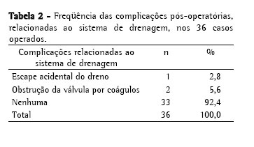 Dos 36 casos operados, somente 1 (2,8%) foi considerado falha do sistema de drenagem, optando-se por substituir a válvula pelo selo d'água.