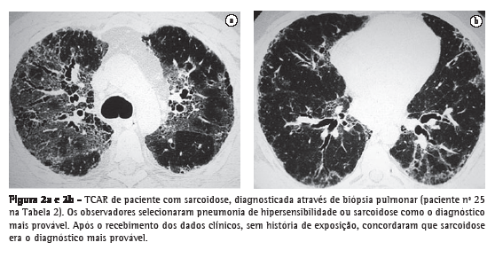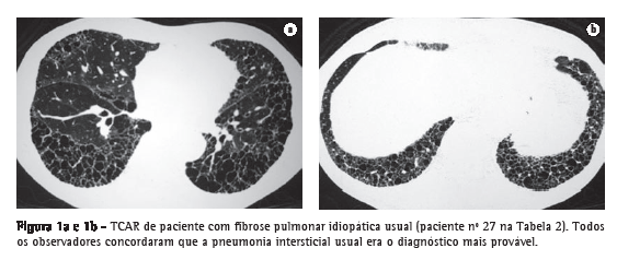Um grupo de autores,(13) ao avaliar apenas imagens de TCAR de pacientes com pneumonia intersticial idiopática, encontrou um valor de kappa de 0,55 para a concordância interobservador independentemente do grau de confiança e um valor de kappa de 0,65 para a concordância interobservador quanto ao diagnóstico com alto grau de confiança. Outro grupo de autores(9) estudou a variação interobservadores para o diagnóstico de DPIs em uma amostra de 11 radiologistas torácicos, comparando imagens de centros secundários e terciários, e encontrou um valor geral de kappa de 0,48. Nesse mesmo estudo, os valores de kappa variaram de 0,60, em centros secundários, a 0,34, em centros terciários. Esses dados demonstram bem a diferença de concordância entre observadores para casos complexos de centros terciários e para casos simples de centros secundários. Em outro estudo,(7) determinou-se a concordância interobservador quanto ao diagnóstico de pneumonia intersticial idiopática. Um aumento significante na concordância foi encontrado após o recebimento das informações clínicas, uma vez que os valores de kappa aumentaram de 0,72 para 0,80.