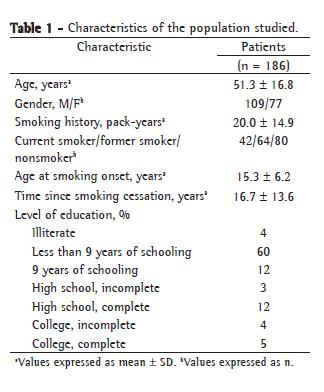We interviewed 186 patients (with or without smoking-related diseases) hospitalized at the Botucatu School of Medicine Hospital das Clínicas in May of 2008. The Brazilian Thoracic Association Smoking Cessation Guidelines(3,14) and the WHO Report on the Global Tobacco Epidemic(1) list the following as smoking-related diseases: COPD; interstitial lung diseases (desquamative pulmonary fibrosis, idiopathic pulmonary fibrosis, respiratory bronchiolitis and histiocytosis X); stroke; coronary diseases; peripheral arterial disease; venous thromboembolism; gastritis; gastric ulcers; duodenal ulcers; preterm labor; and cancer at various sites, such as the lung, oral cavity, larynx, esophagus, bladder, kidneys, pancreas, stomach, colon, rectus, breast and uterus. Patients who were not clinically stable (on mechanical ventilation, with hemodynamic instability or with an altered level of consciousness) were excluded from the present study, as were those who were not able to understand the study protocol. All patients included in the study gave written informed consent using a form that had been approved by the research ethics committee of the institution.