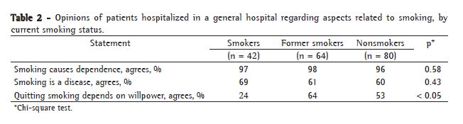 The present study has some limitations. First, only the perspective of the patient was assessed, and this perspective can be influenced by a number of factors (such as memory or even denial). The evaluation of the point of view of health care professionals would provide additional information and allow the delineation of appropriate intervention strategies to approach the problem. The rate of smoking might have been underestimated, since it was not confirmed by means of biological measurements (such as the determination of exhaled carbon monoxide), which might have produced a proportional bias among the groups studied. In addition, the patients were not monitored after being discharged from the hospital in order to evaluate the smoking cessation rate after the intervention made during the hospitalization period.