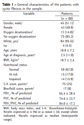 Between March of 2007 and August of 2008, 107 patients with CF were evaluated. Of those, 10 refused to participate in the study and 9 were excluded because they did not complete all the tests required by the protocol. Therefore, 88 patients completed the study.