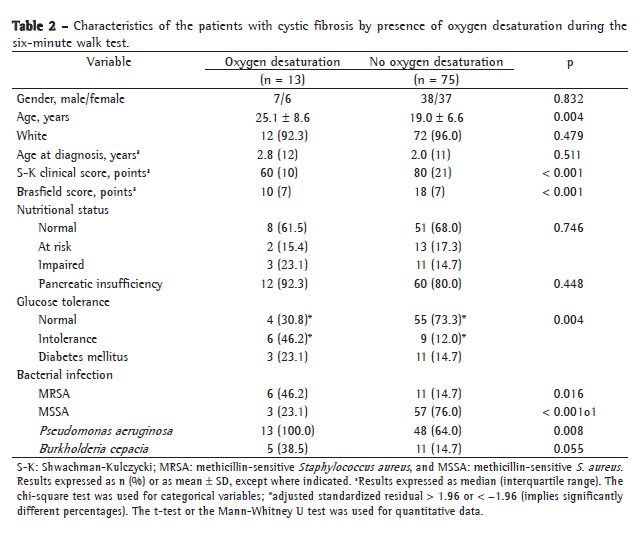 In this sample of patients, 75 (85%) were classified as belonging to the OD− group and 13 (15%) were classified as belonging to the OD+ group. Table 2 shows the characteristics of the patients with CF by presence of oxygen desaturation during the 6MWT. In comparison with OD− group patients, OD+ group patients presented higher mean age (p = 0.004), worse clinical score (p < 0.001), worse radiological score (p < 0.001), higher incidence of glucose intolerance (p = 0.004), lower incidence of methicillin-sensitive S. aureus infection (MSSA, p < 0.001), higher incidence of methicillin-resistant S. aureus infection (MRSA, p = 0.016) and higher incidence of Pseudomonas aeruginosa infection (p = 0.008). There were no significant associations between the groups in terms of age at diagnosis (p = 0.511), gender (p = 0.832), nutritional status (p = 0.746), incidence of pancreatic insufficiency (p = 0.448) or incidence of B. cepacia infection (p = 0.055).