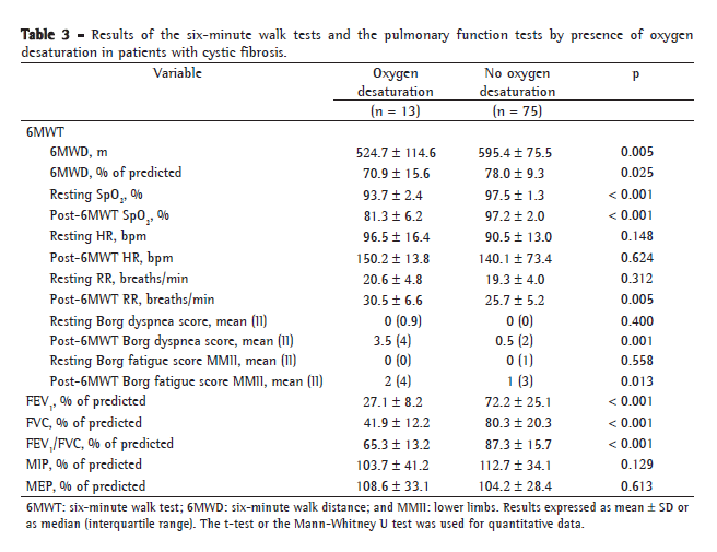 A previous study(8) evaluated submaximal exercise capacity in 41 patients with CF (mean age, 23.7 years) using the 6MWT. It was observed that, although 6MWD was not significantly associated with pulmonary function impairment (p = 0.07), oxygen desaturation during the test was significantly higher in the patients with greater pulmonary function impairment (p = 0.039). The test would be useful in identifying patients with oxygen desaturation and submaximal exercise limitation. However, the factors that can lead to oxygen desaturation in patients with CF during the 6MWT have yet to be described in the literature.