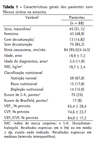 A Tabela 1 apresenta as características gerais dos pacientes com FC. A média de idade foi 19,9 ± 7,2 anos (variação: 10-49 anos). Quanto ao gênero, 45 pacientes eram do sexo masculino, e 43 eram do sexo feminino. A maioria dos pacientes (84) era caucasiana (4 não-caucasianos). A média do IMC foi 19,7 ± 2,4 kg/m² (variação: 13,3-26,1 kg/m²). Nessa casuística, 67% dos pacientes foram classificados como eutróficos, 17% como sob risco nutricional e 16% como desnutridos. A média do VEF1 foi de 65,4 ± 28,4%.