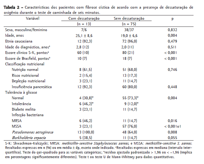 Nessa amostra de pacientes, 75 (85%) foram classificados como SD e 13 (15%) como CD. A Tabela 2 mostra as características dos pacientes com FC de acordo com a presença de dessaturação durante o TC6. Os pacientes do grupo CD apresentaram média de idade maior (p = 0,004), pior escore clínico (p < 0,001), pior escore radiológico (p < 0,001), maior frequência de intolerância à glicose (p = 0,004), menor frequência de infecção bacteriana por methicillin-sensitive S. aureus (MSSA, S. aureus sensível à meticilina; p < 0,001) e maior frequência de infecção por methicillin-resistant S. aureus (MRSA, S. aureus resistente à meticilina; p = 0,016) e por P. ­aeruginosa (p = 0,008) do que os pacientes do grupo SD. Não houve associações significativas entre os grupos quanto à idade do diagnóstico (p = 0,511), sexo (p = 0,832), classificação nutricional (p = 0,746), frequência de insuficiência pancreática (p = 0,448) e frequência de infecção por B. cepacia (p = 0,055).