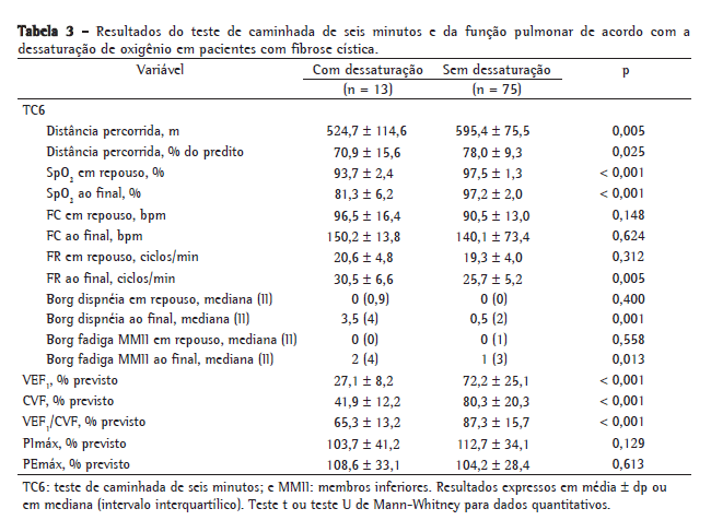 Um estudo prévio(8) avaliou a capacidade submáxima de exercício através do TC6 em 41 pacientes com FC, com média de idade de 23,7 anos. Foi observado que a distância percorrida não se associou significativamente com a gravidade funcional pulmonar (p = 0,07); porém, a dessaturação de oxigênio durante o teste foi significativamente maior nos pacientes com maior gravidade funcional (p = 0,039). O teste seria útil para identificar os pacientes com dessaturação de oxigênio e limitação ao exercício submáximo. Contudo, os fatores que podem levar a dessaturação de oxigênio do paciente com FC durante o TC6 ainda não estão descritos na literatura.