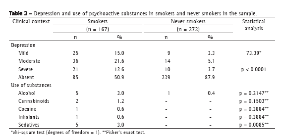 In the present study, there were no significant differences, in terms of the number of cigarettes consumed per day, between smokers who used psychoactive substances other than tobacco or presented with depression (or a combination of the two) and smokers who did not use psychoactive substances or present with depression. One group of authors,(24) however, showed that smokers with fewer depressive symptoms smoked less than one pack of cigarettes per week, whereas those with many depressive symptoms smoked more than two packs of cigarettes per week.