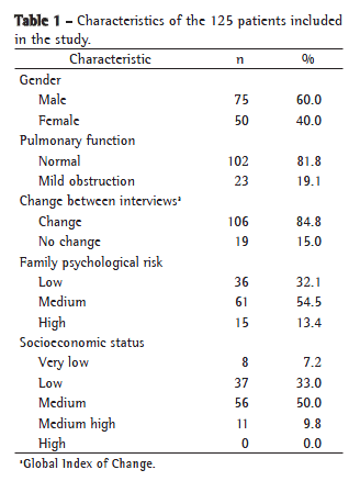 A total of 125 children and adolescents participated in the study, and the mean age was 11 years. Males accounted for more than half of all subjects, and 82% of the participants had normal lung function. Most of the families (67.9%) were at medium or high risk for psychological disorders, and the socioeconomic status was low or very low in 40% of cases. Table 1 summarizes the characteristics of our study sample.