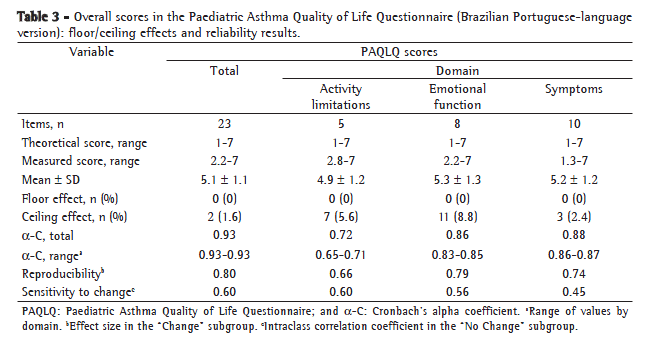 There are similarities between our psychometric findings and those of the original English-language version, as well as between our results and those obtained in versions in other languages. A PubMed database search (March of 2009) for PAQLQ validation studies rendered 13 articles, 8 of which were cultural validation studies.(19,21-27) Of those, there were two different reports of the validation of the Spanish-language version and one regarding the independent Brazilian version previously mentioned. However, among those studies, diverse methodologies were used to assess the properties. Although all fall within the broad classical test theory, the logic of their use (or the lack thereof) was not always explicit or explained in the studies. In a study conducted in Singapore, for instance, only the ICC was calculated(21); in one of the studies conducted in Spain,(24) the sensitivity to change was assessed using the MID, just as the original author of the PAQLQ did in the original study, not associating effect size. Another group of authors provided only the internal consistency intervals.(23) In two other studies, only the convergent validity of the PAQLQ was reported(23,27); only one study evaluated floor/ceiling effects(23); and we were surprised to find that, in another study, no psychometric assessment was performed, the authors justifying that omission by stating that they had found scores similar to those reported in the original PAQLQ study, and that that would be sufficient to consider their validation appropriate.(22) In a validation study, the number of validity and reliability components included should be sufficient to provide an overview of its psychometric performance.(7)