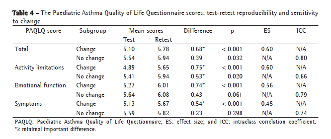 The overall reliability and floor/ceiling effects of the PAQLQ are shown in Table 3. The mean PAQLQ total score was 5.18, the mean domain scores being lowest (4.99) for the activity limitations domain and highest (5.20) for the asthma symptoms domain. Although none of the participants made the lowest possible score for the emotional function domain, some (8.8%) attained the highest possible score for that domain. The Cronbach's alpha coefficient was 0.65 for the activity limitations domain, whereas it was ≥ 0.7 for all of the other domains, as well as for the homogeneity within each domain. For the two subgroups ("change" and "no change"), the changes over time were at acceptable levels (Table 4). In the "change" subgroup, the effect size was 0.6, and the ICC was 0.8 in the "no change" subgroup.