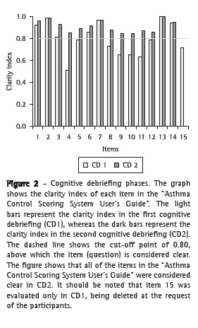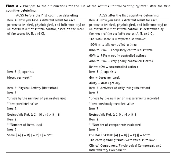 Despite being technically and semantically equivalent to the original instrument, the Brazilian Portuguese-language version of the ACSS corrected and clarified minor discrepancies in the instructions to the original document. For example, in the original version of the ACSS, the instructions for its use are presented in the "ACSS User's Guide" and also in the "Instructions for the use of the Asthma Control Scoring System", resulting in repetition of information and lack of clarity due to the fact that the terms are not standardized. In addition, item 15, which addresses absenteeism, was deleted, because, although the author of the original version agreed that this information is interesting, the item did not appear in the original version of the ACSS and had no impact on the determination of the asthma control score. Because of these small changes, despite the fact they are perceived as unnecessary if a careful method of cross-cultural adaptation has been used, we consider that further studies employing the Brazilian Portuguese-language version of the ACSS are required in order to confirm whether this version of the ACSS provides equally appropriate and valid measurements.