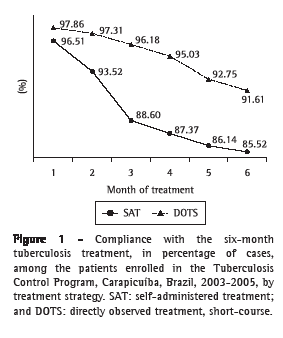 One of the limitations of this study was the comparison between the SAT group and the DOTS group. For ethical reasons, this comparison involved a historical series of patients treated in two different periods. However, the two groups were treated in consecutive years, which implies that were no significant changes in the major sociodemographic variables related to TB or in other important factors related to the various outcomes, except for the change in treatment strategy, from SAT to DOTS. The difference observed in the number of deaths, which was greater in the DOTS group, can be explained by the improved quality of the data in the case reporting and surveillance system databases. After the implementation of the DOTS strategy, it became possible to cross-reference the data in the Mortality Database with those in the São Paulo State Tuberculosis Patients Control System Database, which had not previously been a routine procedure.