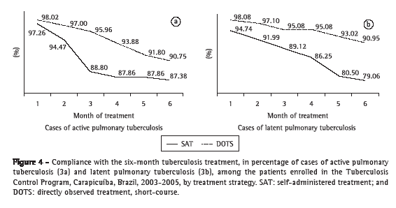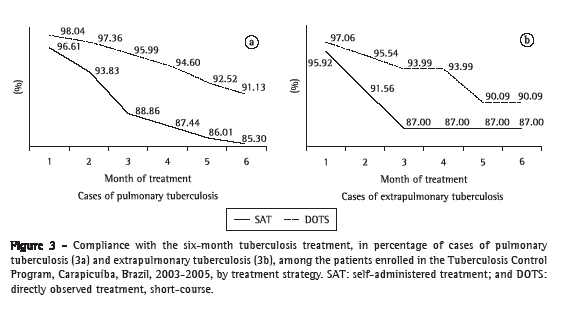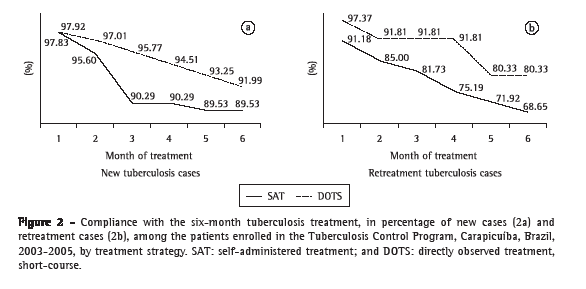 In 2008, approximately 40% of the TB patients in Brazil were treated under the DOTS strategy. However, there have been only a few studies assessing the results of the DOTS strategy in health care facilities and in municipal programs, and those have been uncontrolled.(8,9)