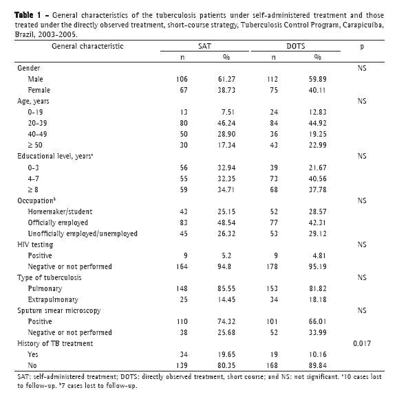 Because our groups were consecutive cohorts of patients enrolled in a local PCT, rather than a probability sample,(10) we used TB reporting forms and patient medical charts in order to compare the SAT and DOTS groups in terms of age, gender, level of education, occupation, HIV serology, localization of TB foci, sputum smear results (AFB detection), and history of TB treatment. The Epi Info 2000 statistical package, version 3.3, was used in order to create a database. We employed double data entry in order to check data consistency and eliminate typographical errors. To compare sociodemographic variables and clinical characteristics, we conducted bivariate analyses using the chi-square test or Fisher's exact test and the same statistical package. The level of significance was set at p < 0.05.